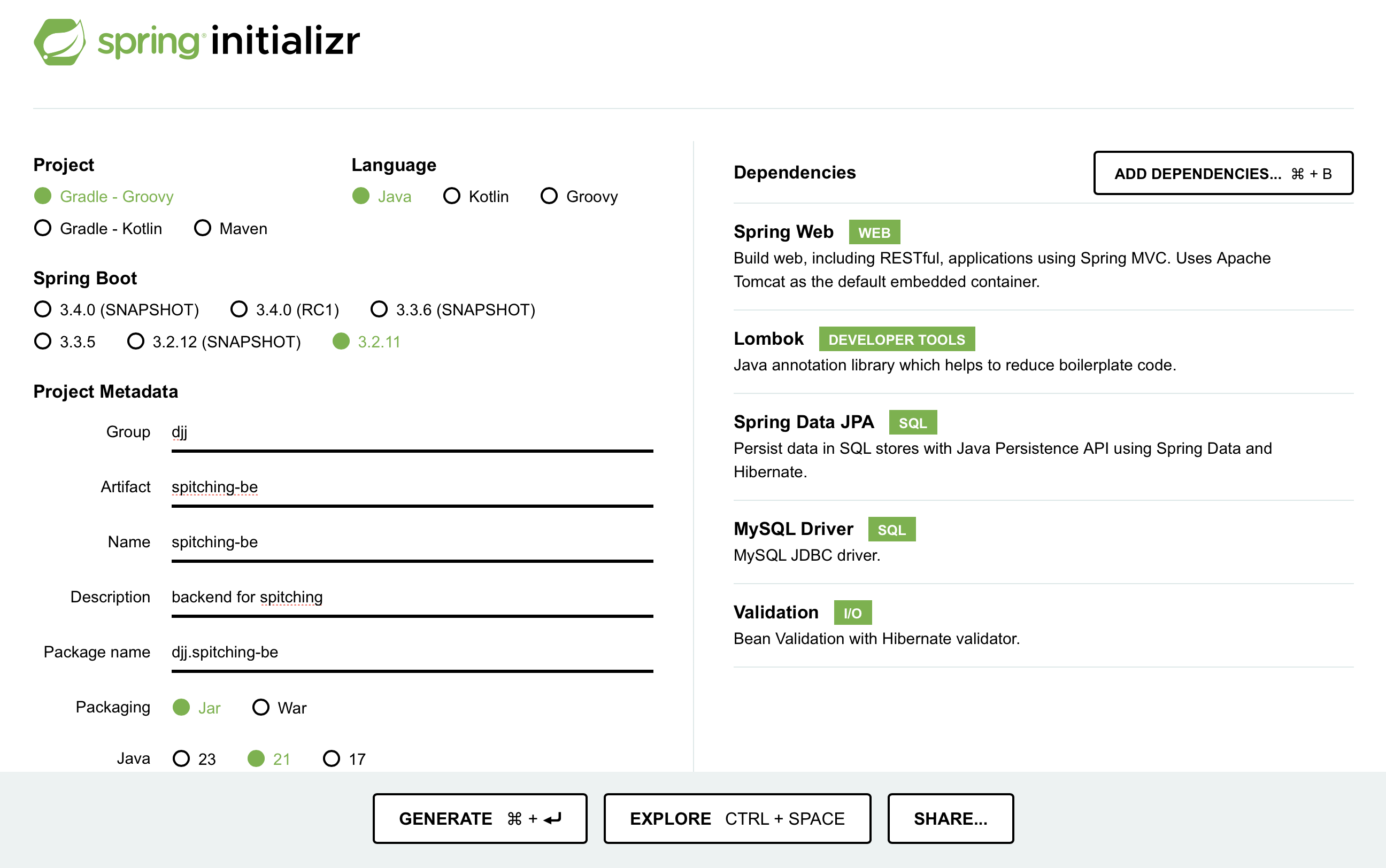 - Description: ์ค๋ช Package name: ํจํค์ง์ด๋ฆ(Group๊ณผ Artifact๋ฅผ ์ค์ ํ๋ฉด ์๋์ผ๋ก ๋ง๋ค์ด ์ค๋ค.)