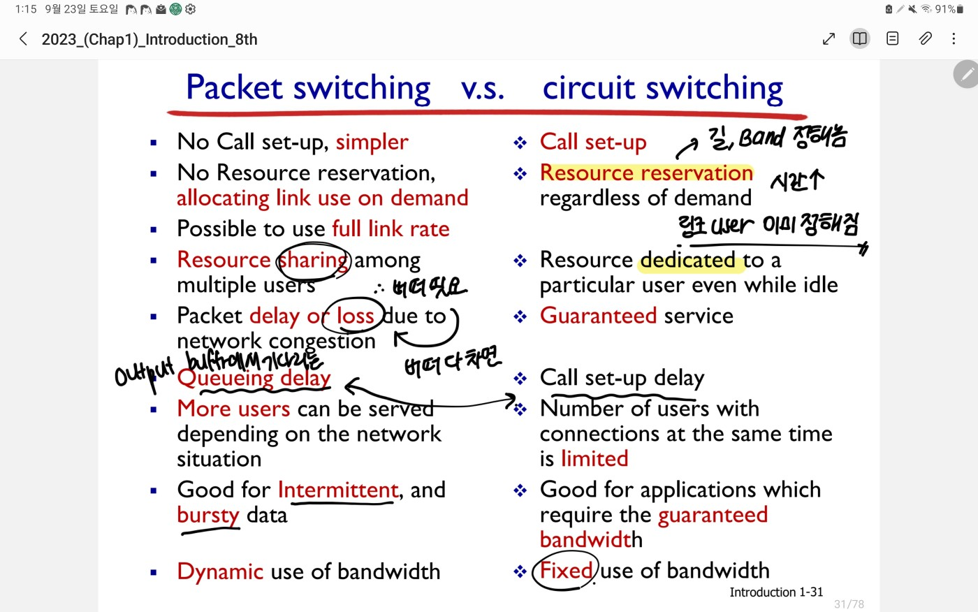 - packet loss (p54): buffer가 유한해서 발생함. reserve restoration을 하지 않는 circuit sw과는 달리, packet sw은 기다리려고 buffer을 마련했는데 그 buffer에도 못 들어가면 loss가 발생