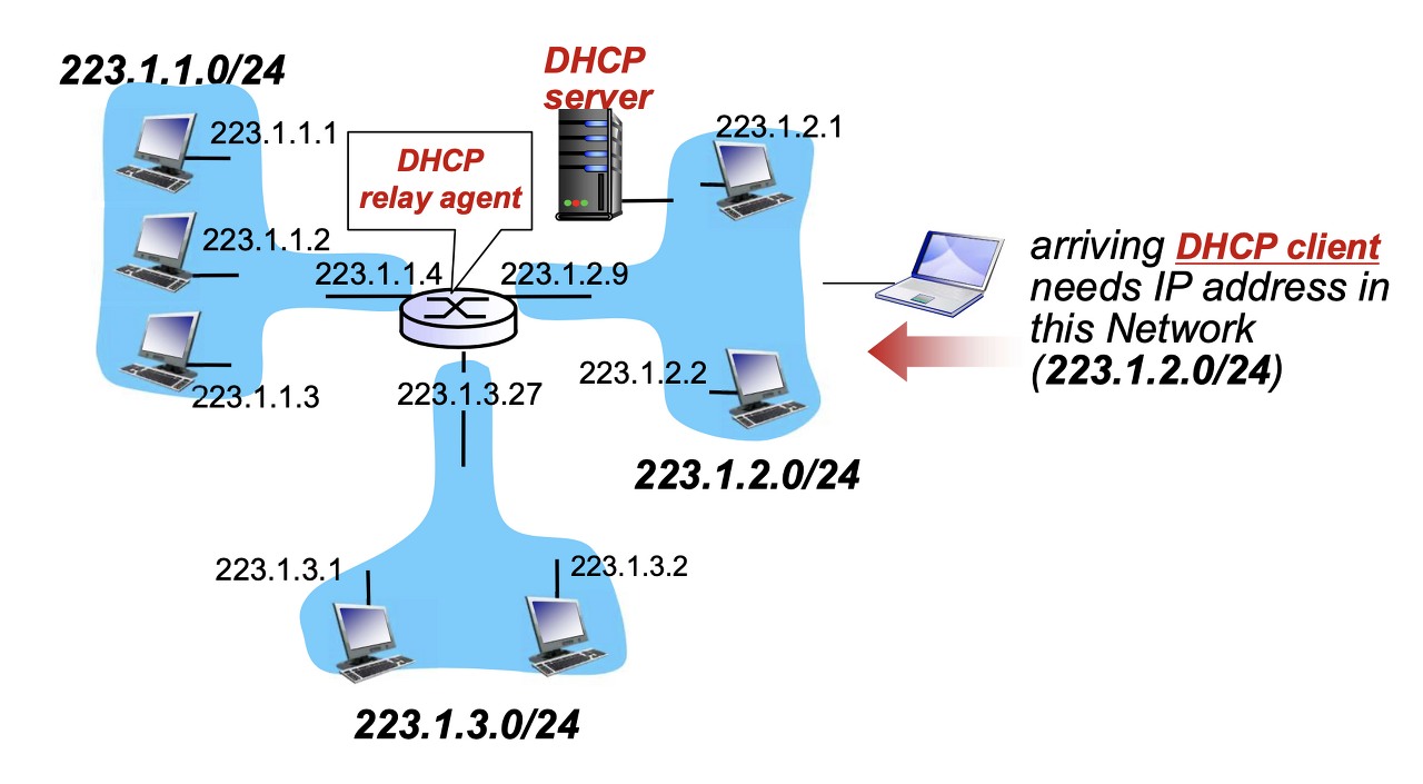 만약 DHCP server가 없는 subnet의 Client가 IP를 할당 받고 싶다면? 라우터에 DHCP relay agent 기능을 넣어 DHCP msg인 것을 알고 모든 subnet으로 broadcast, DHCP server가 있는 쪽에서 메시지를 수신.