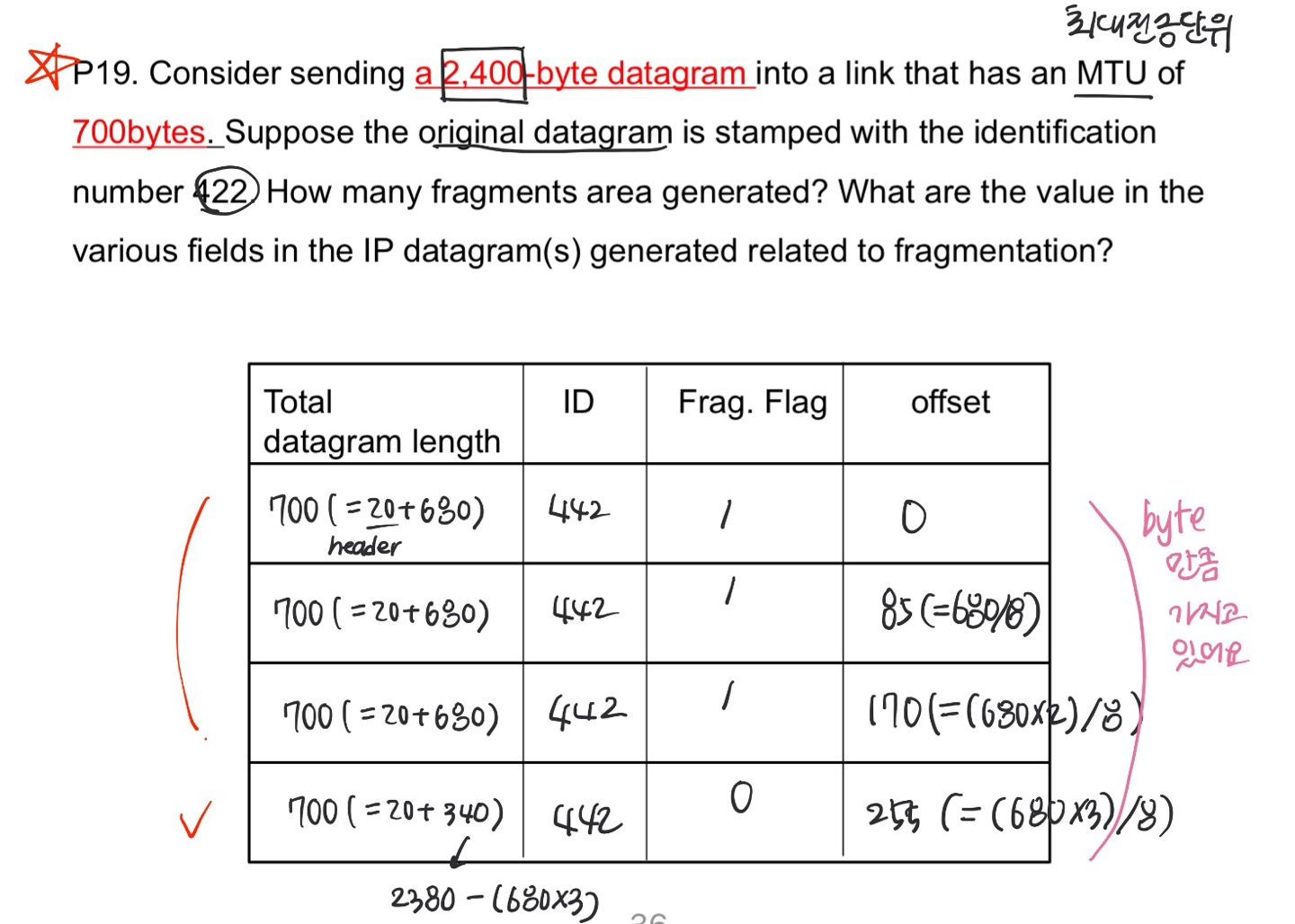 2400 byte Datagram은 20 byte 헤더와 2380 byte 바디로 이루어짐.