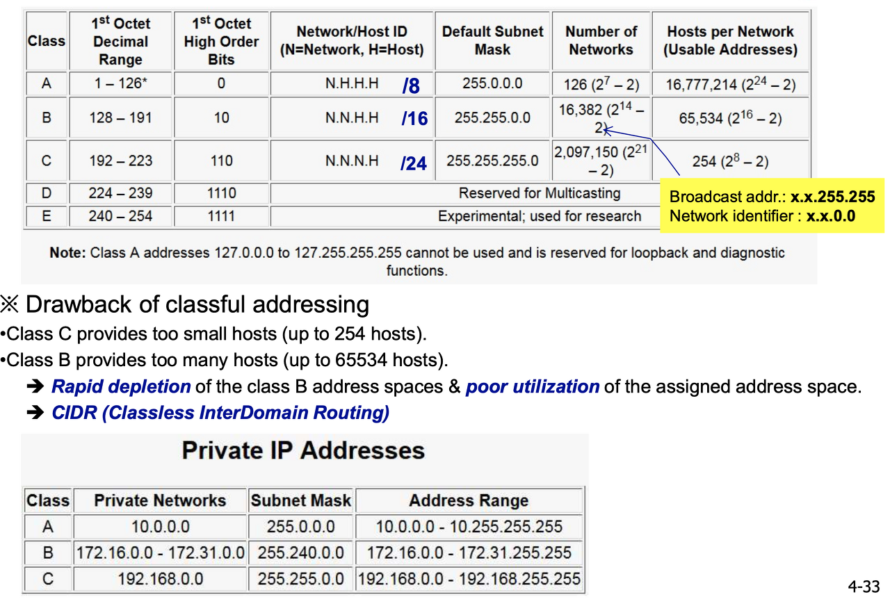 IPv4를 Classful하게 addressing하는 경우와 CIDR(Classless InterDomain Routing)하게 addressing 하는 경우가 있음. 현재 대부분은 CIDR을 사용.