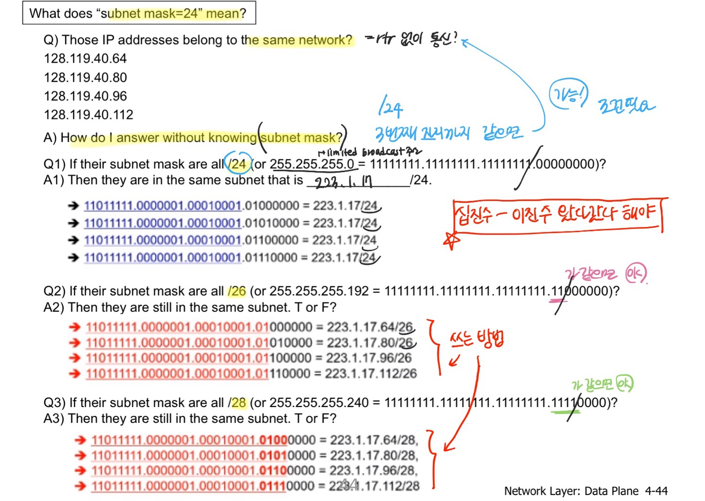 ⇒ 같은 네트워크에 있는지 없는지를 판별하려면 subnet mask를 알아야 한다. 이걸 알려주고 다음의 IP들이 같은 네트워크 상에 있는지 물어봐야 함.
