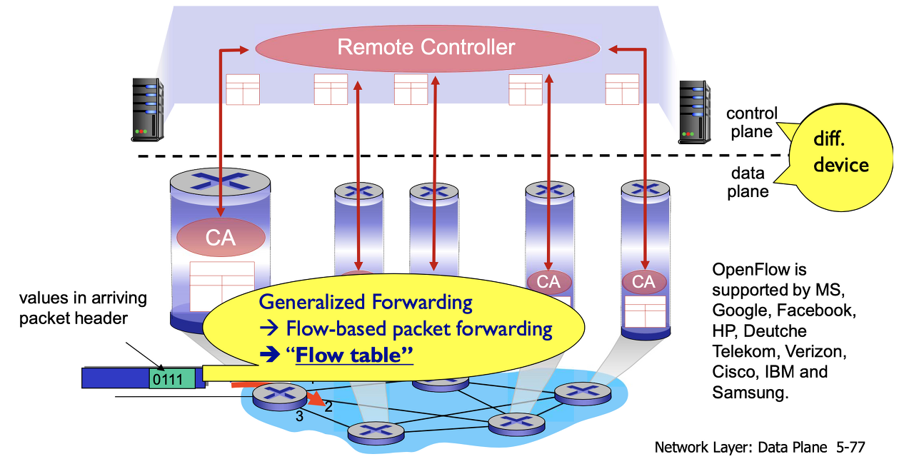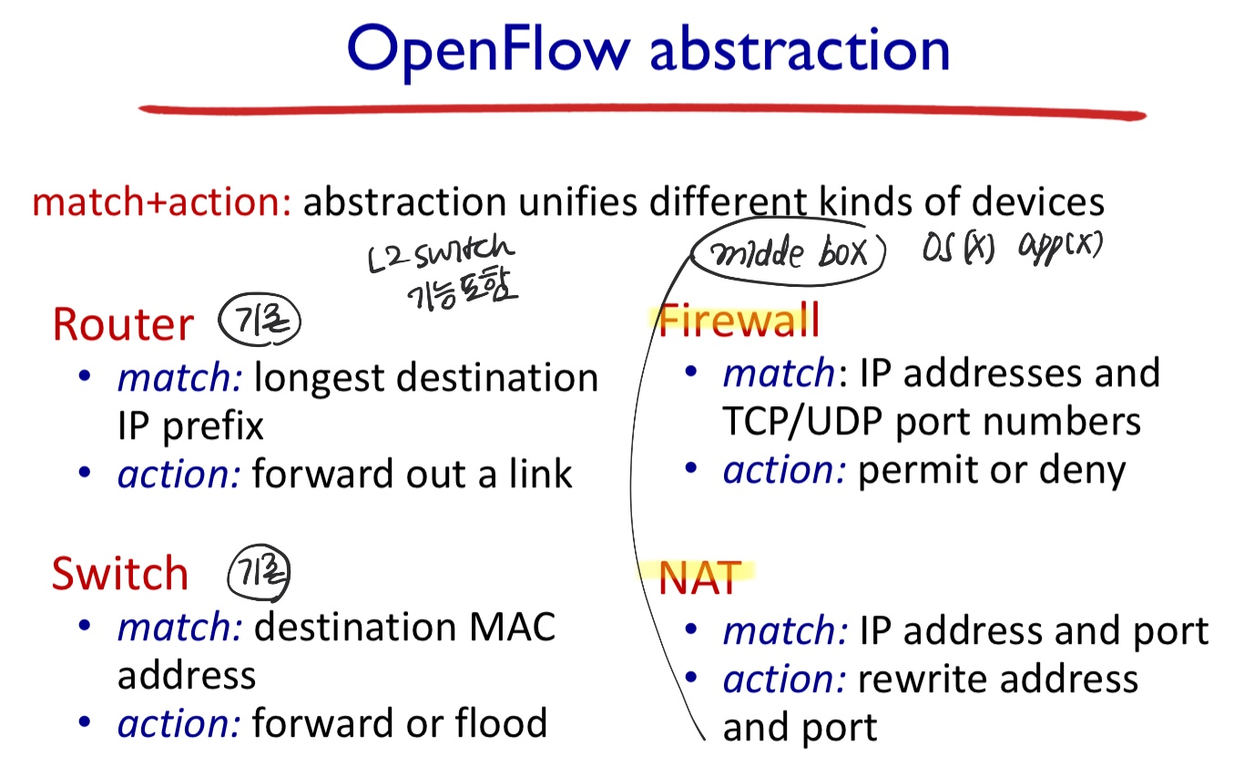 - 그러나 SDN은 제어 방식이 기존 라우터 (destination IP 주소만을 고려하여 forwarding만 실행)와 는 달리 중앙 제어로 할 수 있는 모든 기능을 포함한다.