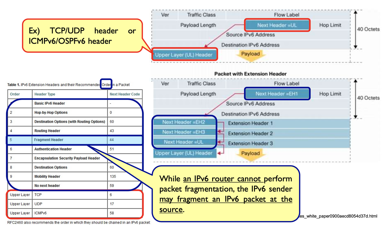 extension header&chaining : 마지막 header가 상위계층을 가리킨다.