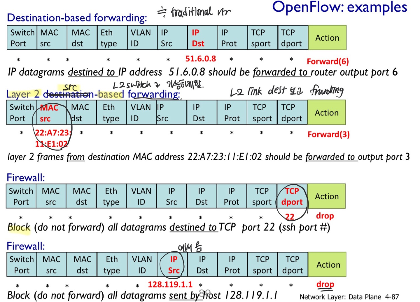 - 도착한 packet의 어떤 layer의 header 값이든 bit를 match하고, action을 취한다