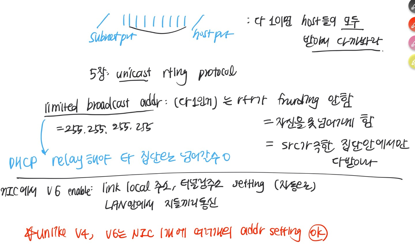 - host에선 해도 router에서는 fragmentation 하지 않으니 frag 필드 필요 없음 (id, flags, offset) ; 너무 크면 버리고 icmp한테 메세지를 보냄