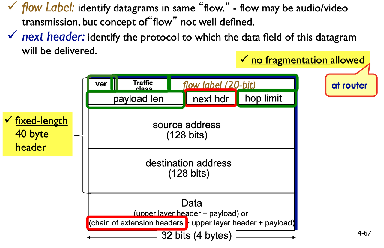 flow label: e2e 흐름. 20 bit할당. 패킷들의 flow를 조절하려고 함. 실패