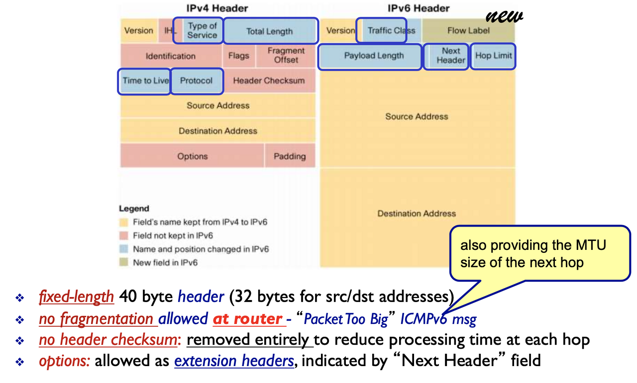 그림에서 노란색 = 그대로 남아있음, 빨간색 = 없어짐, 파란색 = 이름만 바뀜, 초록색 = new in IPv6