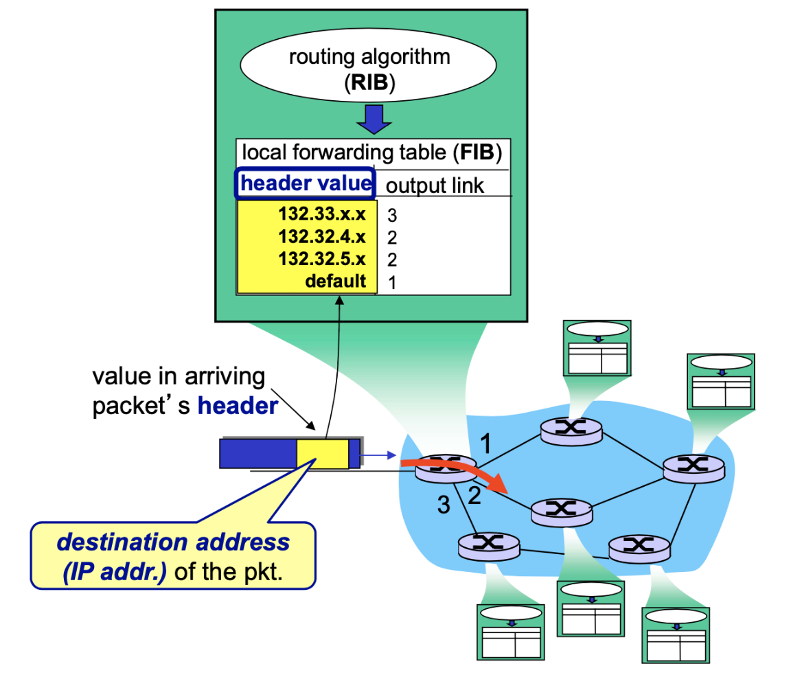 - packet 헤더의 destination addr를 보고, router의 forwarding table(FIB: Forwarding Information Base)를 매치해 output port를 찾아 forwarding (switching). router의 ingress buffer → output buffer